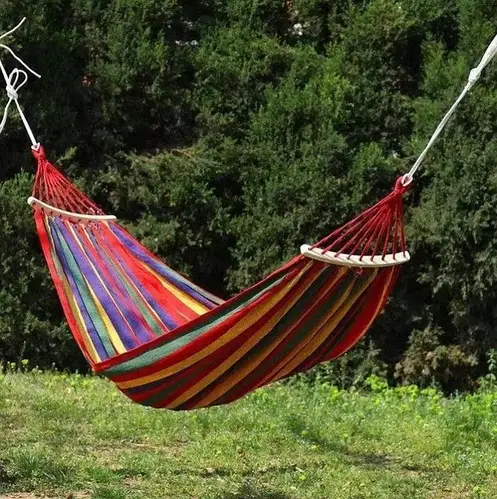 Гамак подарує Вам комфортний відпочинок на природі. Він виконаний з бавовни і здатний витримувати навантаження до 180 кілограм. Він легкий і компактний, поставляється в бавовняному мішечку-чохлі. Такий гамак можна взяти з собою в похід - в складеному вигляді він займає дуже мало місця.