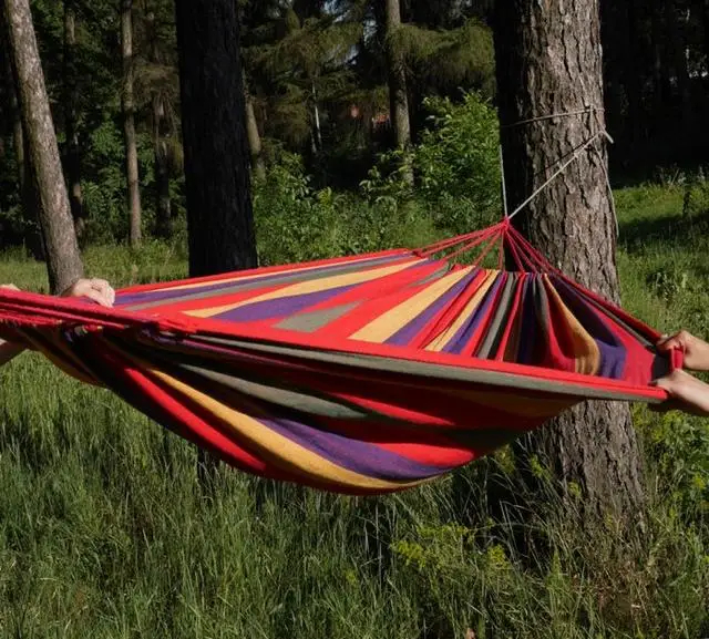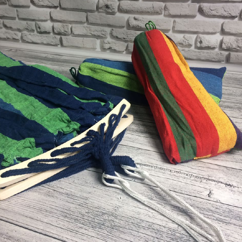 Гамак подарує Вам комфортний відпочинок на природі. Він виконаний з бавовни і здатний витримувати навантаження до 180 кілограм. Він легкий і компактний, поставляється в бавовняному мішечку-чохлі. Такий гамак можна взяти з собою в похід - в складеному вигляді він займає дуже мало місця.